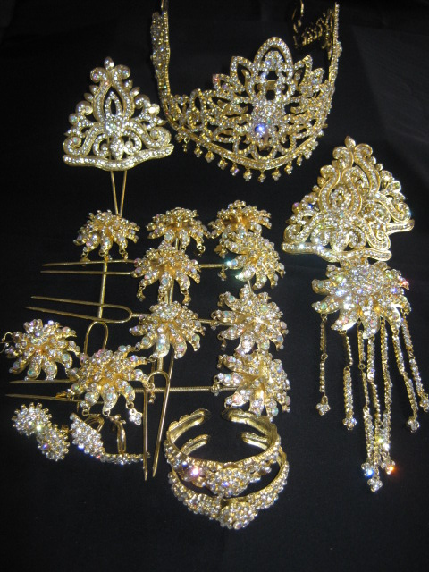Bahan utama kuningan, kokoh dan kekar, lapis emas, full batu hidup, terdiri dari kembang goyang 7 bh, bros 1 bh, kalung 1 bh, gelang 1 ps, cincin 1 ps, giwang 1 ps, klap bahu 1 ps, penetep 1 bh dan mahkota 1 bh.