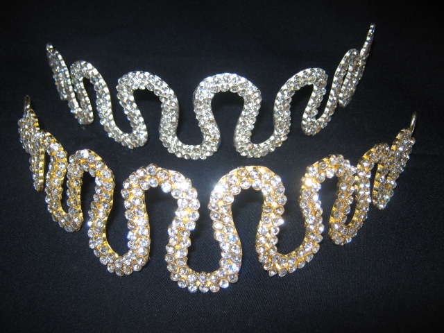 Bahan tembaga dan kuningan berbentuk spiral, ukuran lingkar kepala 30 cm dengan finishing lapis emas dihias dengan batu cantik.