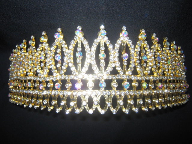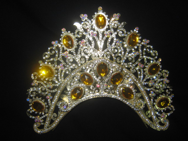 Mahkota bahan kuningan lapis emas, batu hidup, ukuran tinggi 16 cm, lebar 27 cm. Warna batu besar bisa diganti sesuai keinginan.