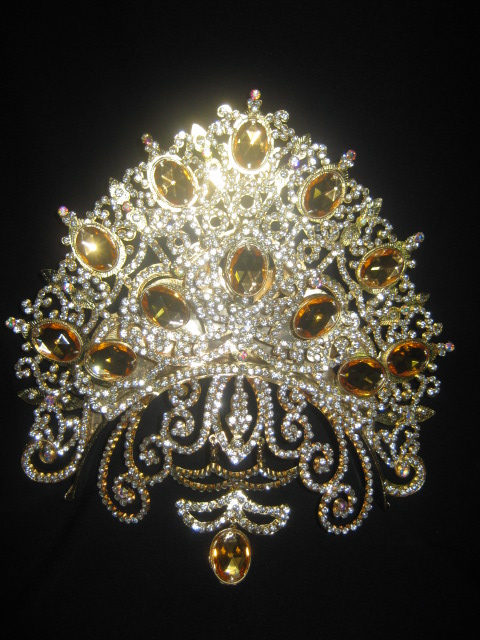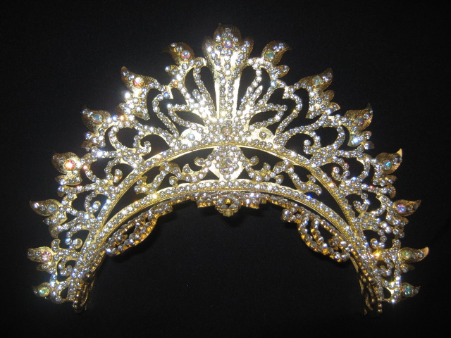 Mahkota bisa untuk jilbab, bahan kuningan lapis emas, batu hidup, ukuran tinggi total sampai mainan 25 cm lebar 24 cm. Album perhiasan nikah lainnya dapat diakses di www.facebook.com/perhiasannikah.