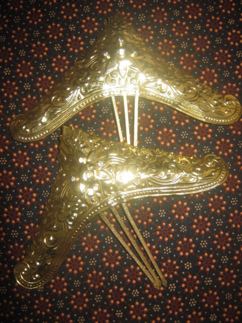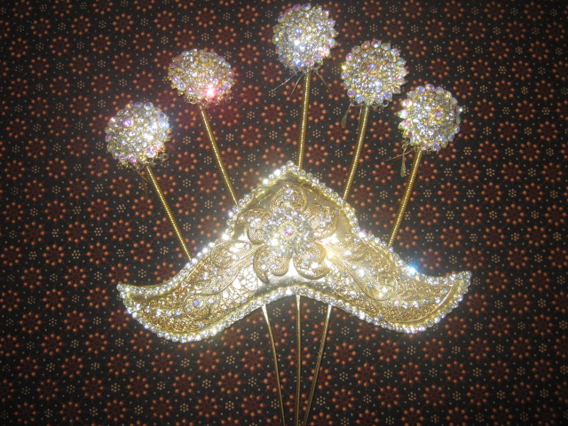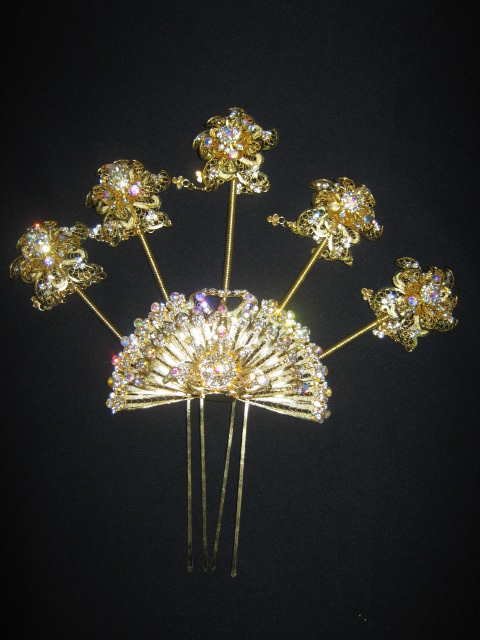Tusuk rambut sari ayu gaya Anisa Pohan, penuh batu cantik dengan 5 tangkai bunga, dilapis emas ukuran panjang 25 cm tinggi 19 cm.
