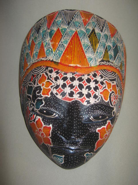 Hiasan dinding berupa Topeng kayu sengon dibatik dengan cat motif bunga, tersedia 2 warna hitam dan merah ukuran tinggi 12 cm lebar 9 cm.