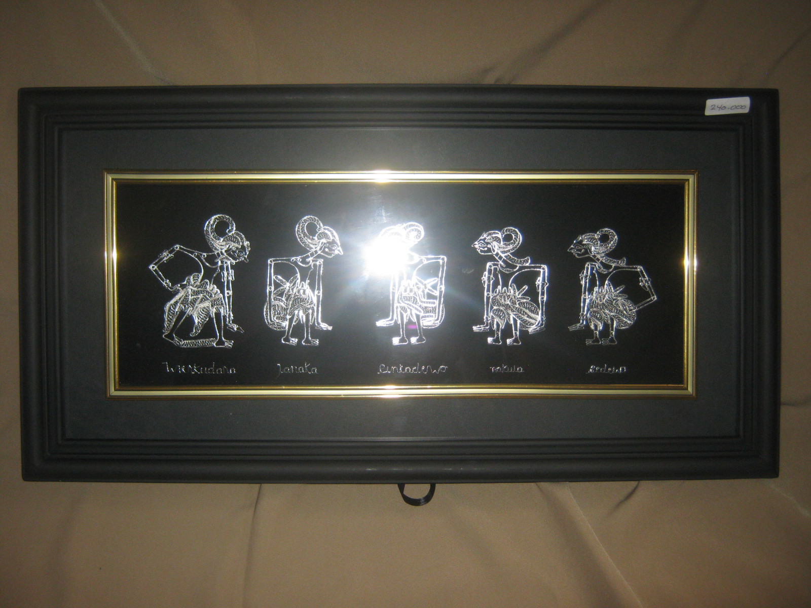 Hiasan dinding bentuk pigura wayang pendawa lima ukuran 9 cm, bahan tembaga di finishing dengan perak. bisa untuk digantung di dinding dan di pasang di atas meja. Melayani pemesanan berbagai jenis wayang dengan berbagai ukuran, harga kompetitif. Untuk informasi dan pertanyaan silahkan SMS ke 0813 2873 1896 / Email cinderamata_jogja@yahoo.com. |
