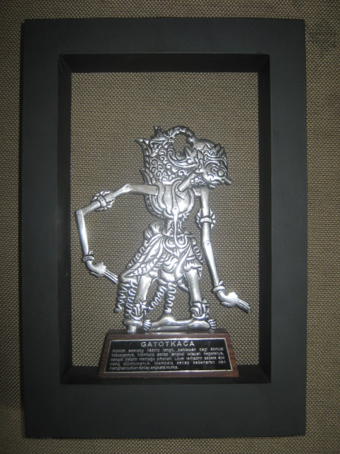 Bahan alumunium, tinggi wayang 15 cm model 3 dimensi. Ukuran frame tinggi 28 cm, lebar 19 cm, tebal 4.5 cm. Tangan wayang bisa digerakan.Lengkap dengan nama wayang dan keterangannya. Dudukan wayang kayu sonokeling. Pigura terbuat dari MDF (papan serat kayu). Tersedia berbagai macam tokoh wayang.